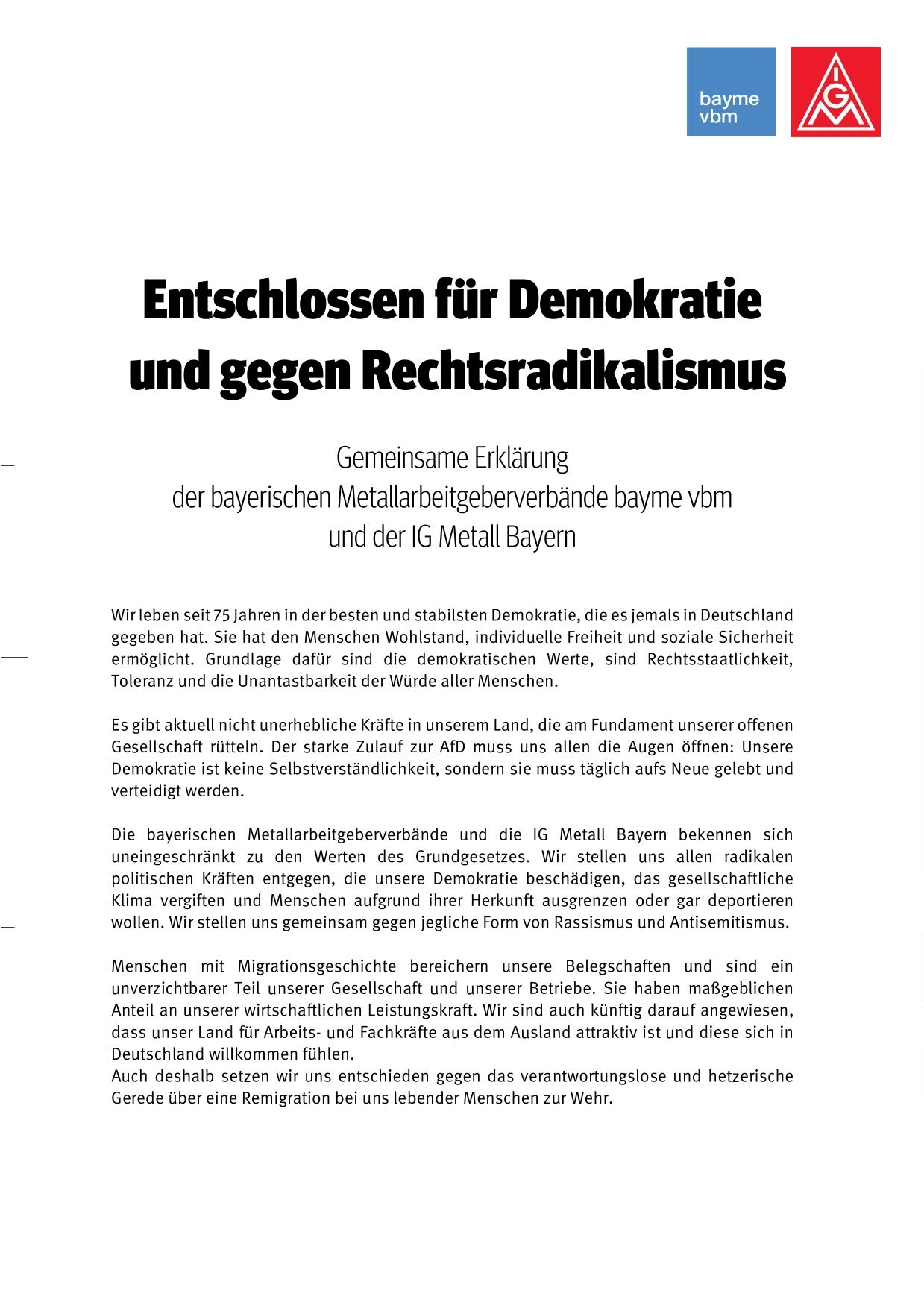 Es gibt aktuell nicht unerhebliche Kräfte in unserem Land, die am Fundament unserer offenen Gesellschaft rütteln. Der starke Zulauf zur AfD muss uns allen die Augen öffnen: Unsere Demokratie ist keine Selbstverständlichkeit, sondern sie muss täglich aufs Neue gelebt und verteidigt werden. Die bayerischen Metallarbeitgeberverbände und die IG Metall Bayern bekennen sich uneingeschränkt zu den Werten des Grundgesetzes. Wir stellen uns allen radikalen politischen Kräften entgegen, die unsere Demokratie beschädigen, das gesellschaftliche Klima vergiften und Menschen aufgrund ihrer Herkunft ausgrenzen oder gar deportieren wollen. Wir stellen uns gemeinsam gegen jegliche Form von Rassismus und Antisemitismus.