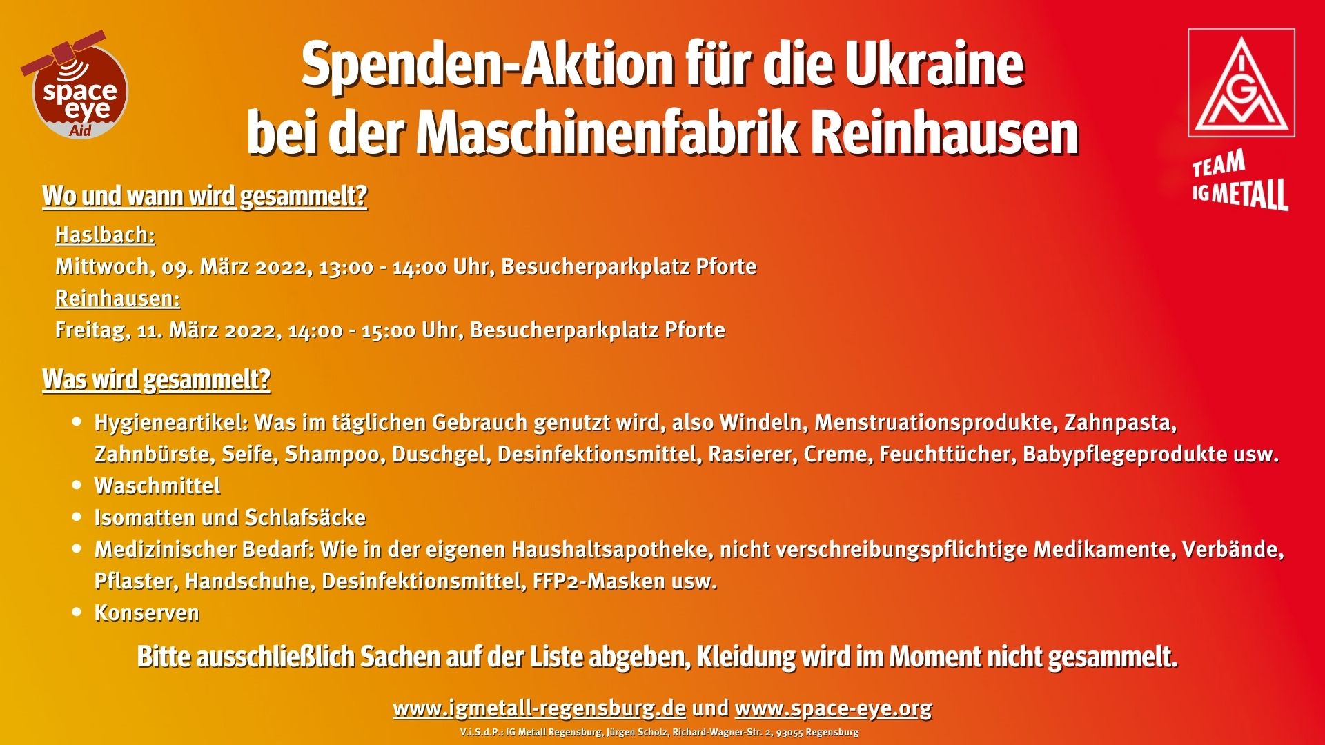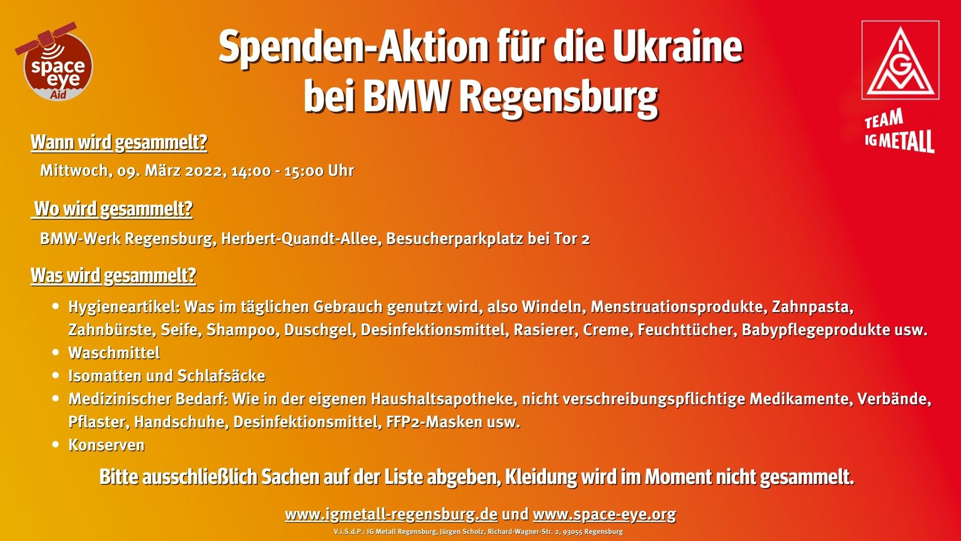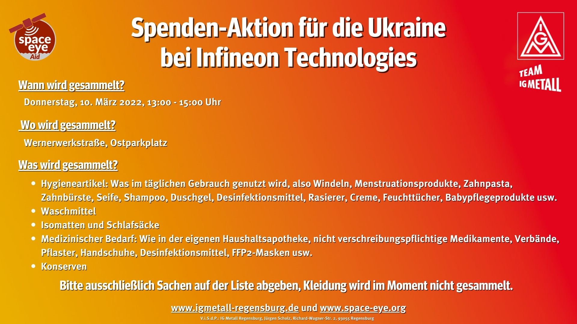 Gemeinsam mit dem Verein space-eye organisiert die IG Metall Regensburg in den großen Regensburger Betrieben Sachspenden-Sammelaktionen, um den Menschen in der Ukraine zu helfen.